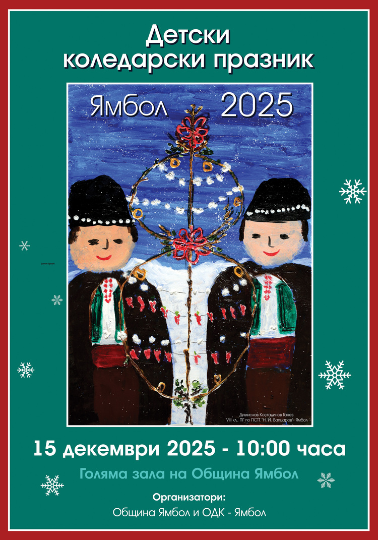 На 15 декември от 10:00 часа на сцената в зрителната зала на Община Ямбол ще излязат над 200 малки коледари от детските градини „Пламъче“, „Щастливо детство“, „Червената шапчица“, „Слънце“, „Пролет“, „Валентина“ и „Биляна“, от Обединено училище „Д-р Петър Берон“ и основните училища „Йордан Йовков“ и „Любен Каравелов“, както и от детските групи „Квартал Боровец“ и „Багера“ към Народно читалище „Зора-1945“.