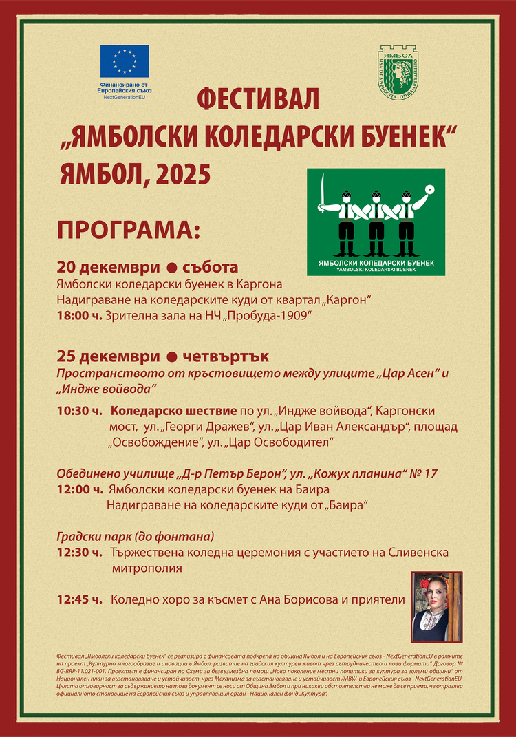 Фестивал „Ямболски коледарски буенек“ се реализира с финансовата подкрепа на община Ямбол и на Европейския съюз - NextGenerationEU в рамките на проект „Културно многообразие и иновации в Ямбол: развитие на градския културен живот чрез сътрудничество и нови формати“, Договор № BG-RRP-11.021-001. Проектът е финансиран по Схема за безвъзмездна помощ „Ново поколение местни политики за култура за големи общини“ от Национален план за възстановяване и устойчивост чрез Механизма за възстановяване и устойчивост /МВУ/ и Европейския съюз - NextGenerationEU. Цялата отговорност за съдържанието на този документ се носи от Община Ямбол и при никакви обстоятелства не може да се приема, че отразява официалното становище на Европейския съюз и управляващия орган - Национален фонд „Култура“.